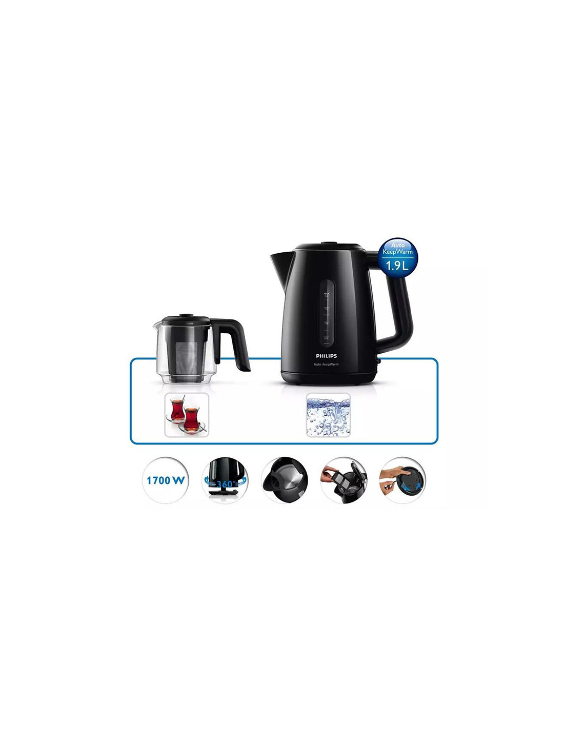 | With the Philips Teamaker you can make tea for your whole family with the large 1.9 L content of kettle. The Auto Keep Warm function keeps the tea warm so you can drink tea, whenever you want. | |