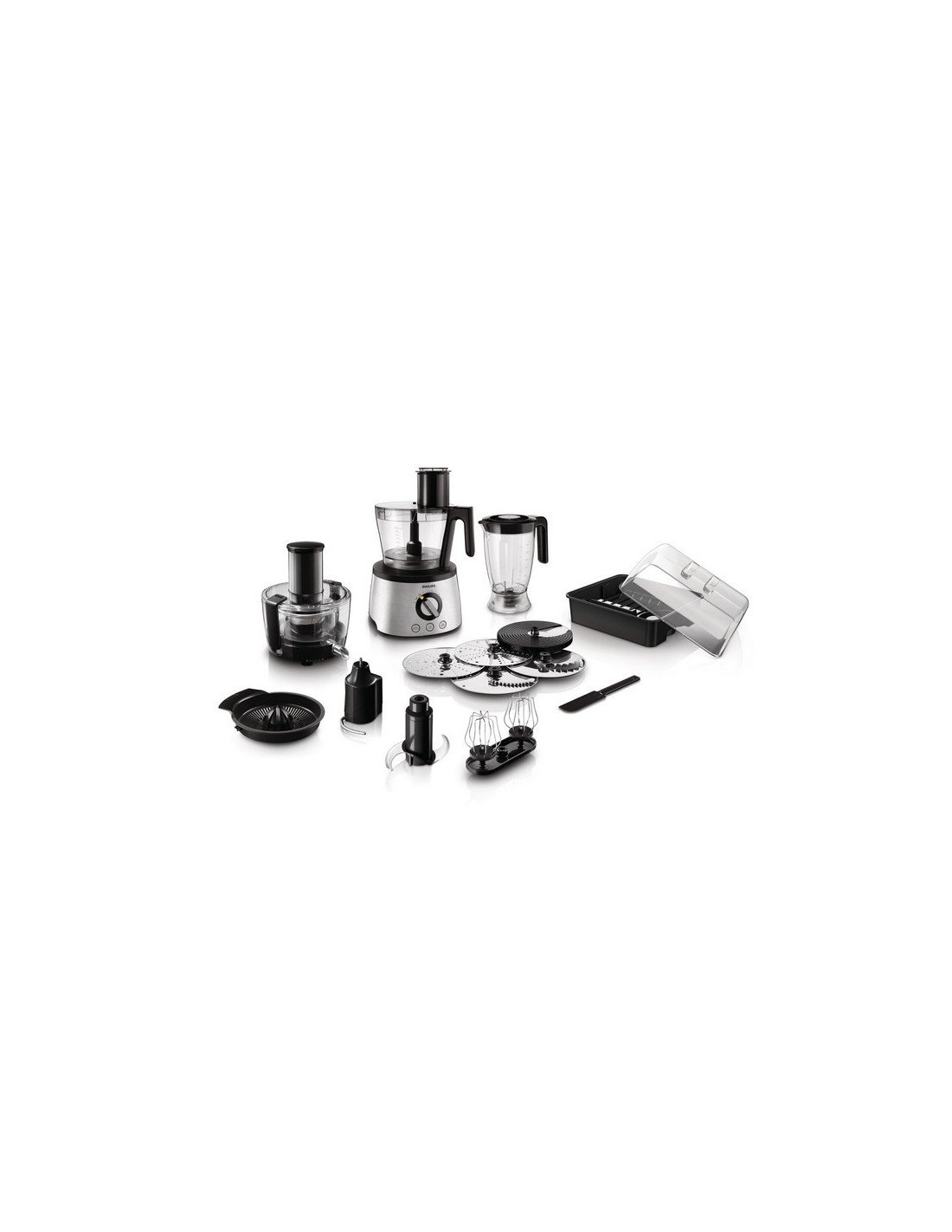French fries disc, julienne cutter disc, chopping blade, spatula attachment, balloon beater, kneading tool, granulating disc, adjustable slicing disc (1-7 mm), reversible shredding disc (fine/coarse) |