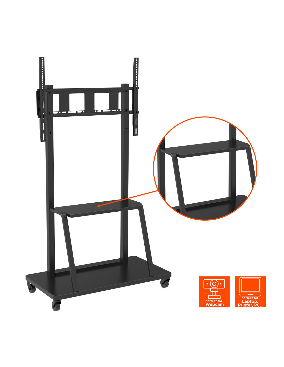 Thanks to the integrated shelf and wide base, which can beused as additional mobile storage space, this trolley offers enough space for alot of existing equipment, such as players, PC / laptops, collaborationsystems, etc..