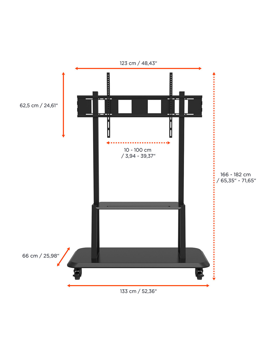 Thanks to the integrated shelf and its wide base, which canbe used as additional mobile storage space, this trolley offers enough spacefor a lot of existing equipment, such as players, PC / laptops, collaborationsystems, etc.