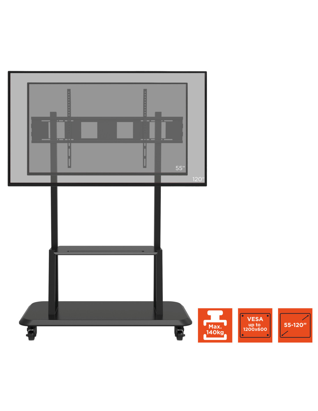 The display stand supports screens up to more than 120'(please note the Vesa standard and total weight of your display) and loadcapacity of up to 140 kg making this display stand from celexon the perfect standfor picture-perfect displays.