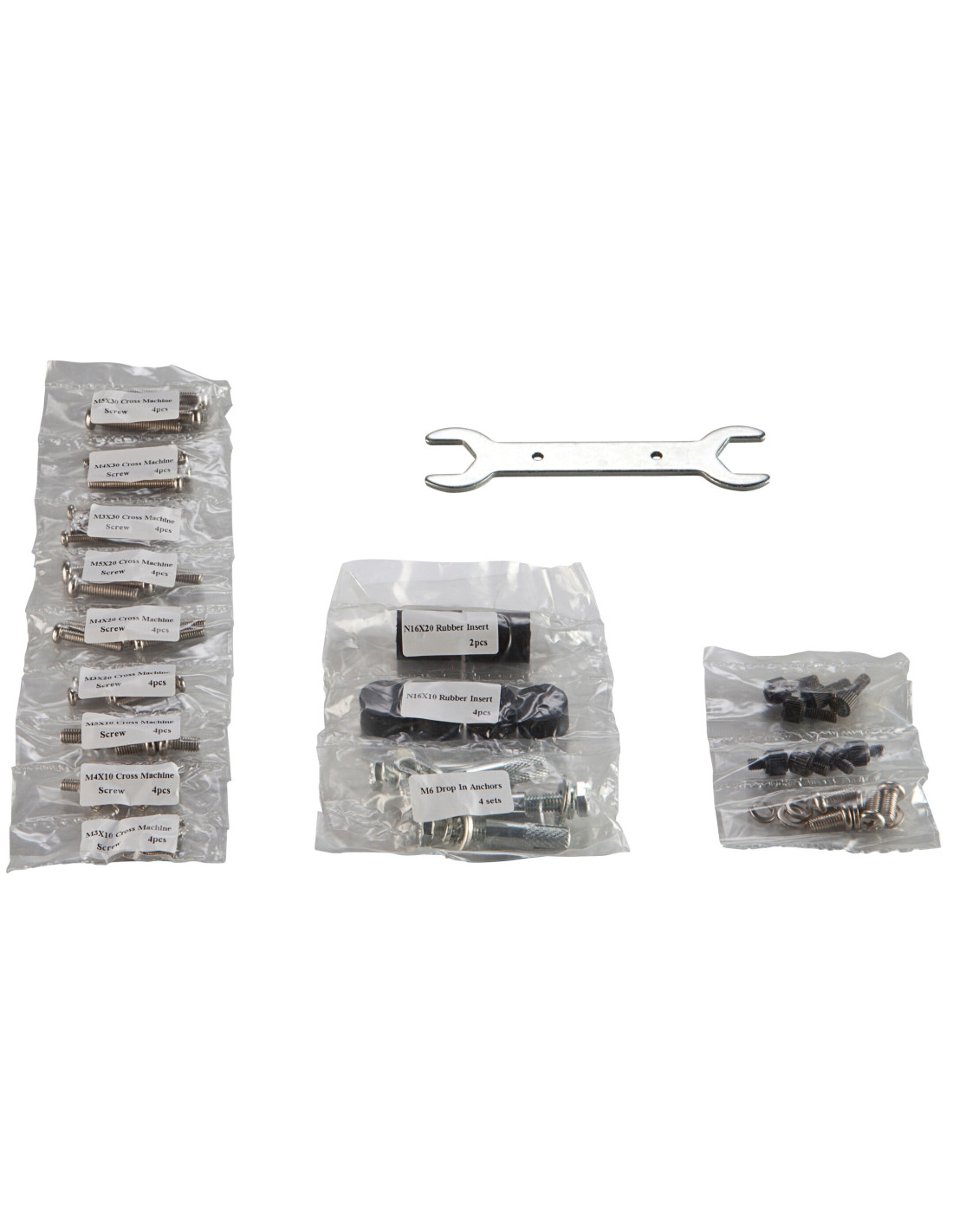 4 x M3, M4 and M5 screws in 10mm, 20mm and 30mm. 4 x N16x10mm bolt spacers, 4 x stud bolts (incl M6 screws) + some spare screws and a allen key for the MultiCel Expert series.