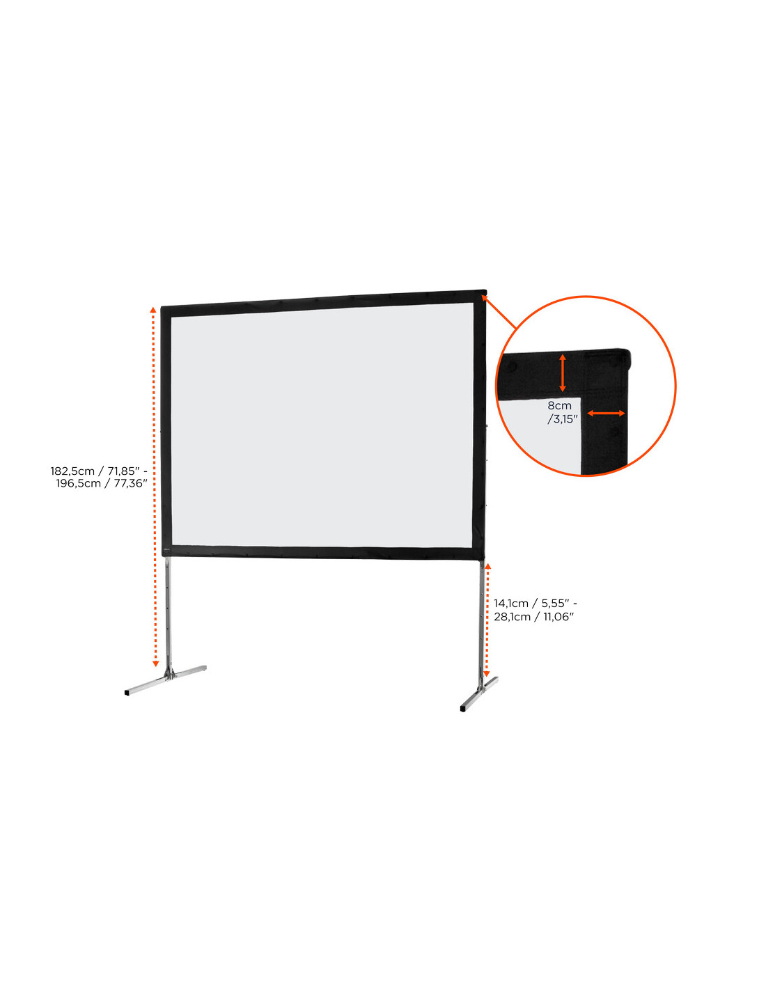 The celexon Folding Frame screen can be set up in minutes without tools. The screen fabric is fastened by poppers onto the front on the aluminum frame. The feet can be mounted at different heights and provide a stable stand. A rugged flightcase protects the screen during transport and when not in use.