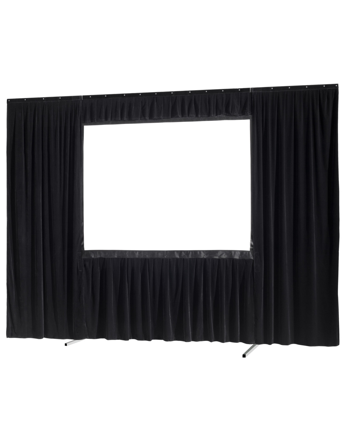 The drape kits are available in 2 different versions - a single skirt for just the bottom of the screen, or a complete surround for all 4 sides. The drapes are black velour-coated, completely opaque and absorb ambient light reliably.