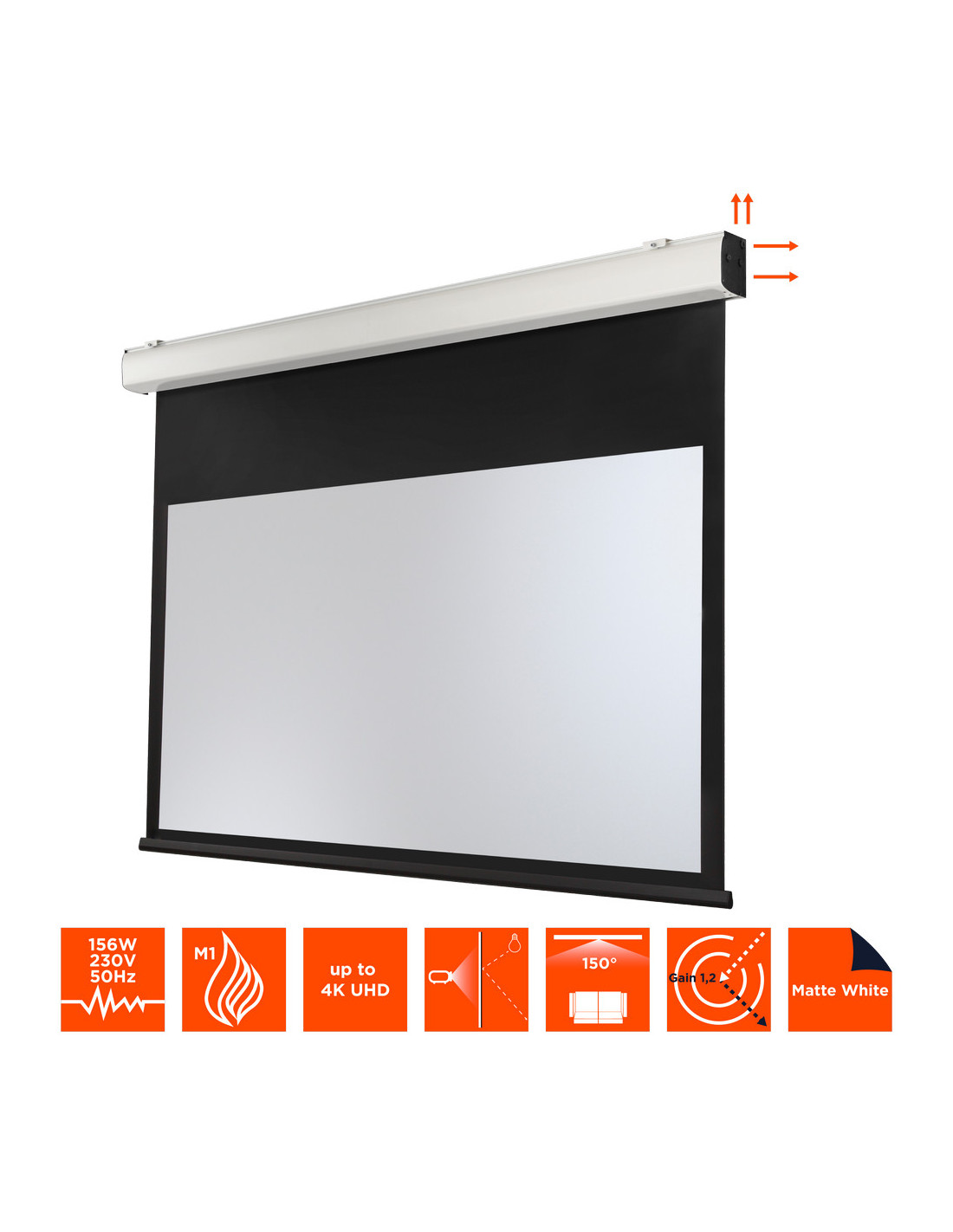 The screen is operated by a very quiet Gaposa motor. It issupplied complete with screen, wall switch (+ cable) and user manual. Optionalaccessories: Recessed ceiling installation kit, remote control and 12V triggerset.