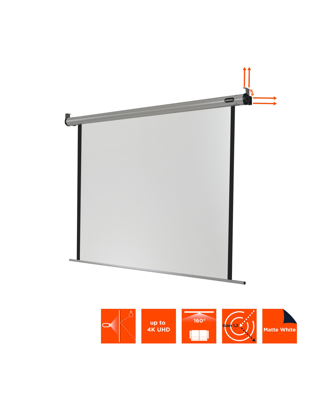 The 'Home Cinema' series is ideal for the well-equipped home cinema market as well as the high-tech business environment. The screen can be operated by remote control or from a wall-mounted control box. The motor operates extremely quiet. It is suitable for wall or ceiling mounting. With its high-quality thick and heavy fabric, the screen offers an excellent flatness. It is variable height adjustable and suitable for different aspect ration formats. The gain factor of the screen is 1.2 so it is suitable for both LCD and DLP projectors and allows a wide viewing angle. The black border surround improves the contrast and clarity of the picture. Included in the delivery are a control box (wall mounted, a remote control device (plus batteries), the fixings for the wall or ceiling mount as well as a user guide.